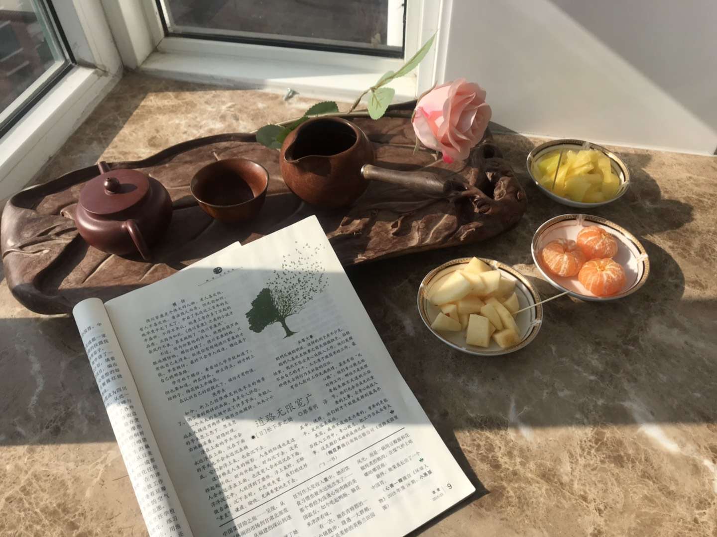 因?yàn)檠捞,這個(gè)周末穩(wěn)穩(wěn)宅在家中。睜眼醒來(lái)已經(jīng)是太陽(yáng)高照了,不急不慌梳洗完畢,簡(jiǎn)單吃個(gè)早餐?粗巴鉁嘏年(yáng)光,先給老爸老媽發(fā)個(gè)視頻,問(wèn)候一下老兩口,順便讓遠(yuǎn)在東北的他們看看銅川的藍(lán)天白云。老兩口第一句話就是問(wèn)我的牙疼好了嗎?真是親爹娘哦。雖然我已經(jīng)年過(guò)半百,但在他們心中,我還是那個(gè)需要關(guān)照的小女孩,豈不知他們已經(jīng)是耄耋之年,需要我們的照顧了。八八九九聊會(huì)天,把常在嘴邊念叨著的“快快樂(lè)樂(lè)活好每一天”的結(jié)束語(yǔ)說(shuō)完,擺擺手關(guān)掉視頻。環(huán)顧一下屋子,擺弄一下種的紅薯葉子,滿眼的綠色,讓我拿起電話給送花小哥“今天能給我送兩把花嗎?”“可以,但要到下午兩點(diǎn)以后才回老區(qū)。等一下吧!薄安恢保矣心托牡! 放下電話,干點(diǎn)什么呢?望著灑滿陽(yáng)光的飄窗,讓我一下子來(lái)了興趣。餐桌上的小茶臺(tái)讓我搬上了飄窗,一支玫瑰花斜斜地插在茶臺(tái)上,沏上一壺白茶,拿出一本《讀者》,背對(duì)陽(yáng)光坐在飄窗上,慢慢翻開(kāi)書頁(yè)......慢著,讓我先拍個(gè)照,自我欣賞一下。好像少點(diǎn)什么,又匆匆轉(zhuǎn)身回廚房,切一小塊蘋果、剝兩個(gè)小蜜橘,洗一個(gè)朋友送的楊桃,做成三個(gè)小果盤擺放茶臺(tái)周圍,喜滋滋享受著小資情調(diào),回味著朋友的貼心。咬一口小蜜橘,怎么是酸的?瞬間讓我想起兒時(shí)姐弟間嬉戲爭(zhēng)搶的場(chǎng)景。可能真的是老了,變得愛(ài)回憶了。搖搖頭,回到現(xiàn)實(shí)。 牙疼還不忘記吃?一邊自我數(shù)落著,一邊翻開(kāi)雜志瀏覽著。一篇《預(yù)留一分鐘》的文章,讓我在冬日的暖陽(yáng)中更加溫暖。文章中講的是紐約地鐵一年365天、每天24個(gè)小時(shí)都在不停運(yùn)轉(zhuǎn)。但是大家不知道的是每輛車發(fā)車和離開(kāi)的時(shí)間都比時(shí)刻表差一分鐘。這預(yù)留的一分鐘,是為了給那些只差這一點(diǎn)點(diǎn)時(shí)間就可以匆匆走下站臺(tái)邁上列車的乘客提供一個(gè)寬限期。而這一分鐘,可能意味著是與家人共進(jìn)晚餐還是用微波爐熱剩飯這樣的差別。且列車開(kāi)動(dòng)后很快會(huì)把這一分鐘趕回來(lái),正點(diǎn)到達(dá)。地鐵公司發(fā)言人說(shuō):“盡管預(yù)留的一分鐘與精確到秒的鐵路文化不相符,但它充滿了人性和活力,這一點(diǎn)讓我們很自豪!笔茄剑覀?cè)谏钪谐3S羞@樣那樣的不如意,不開(kāi)心,何不敞開(kāi)心扉,給自己、給他人都預(yù)留一分鐘,就是中國(guó)人的古話:忍一時(shí)風(fēng)平浪靜,退一步海闊天空。有時(shí),生活就是一種妥協(xié),一種忍讓,一種遷就,后退一步也是一種智慧,更是一種美。 冬天的太陽(yáng)溫度一點(diǎn)也不低,我的后背已經(jīng)出汗了。放下書,喝口茶,看著靜悄悄的院子,沉浸在自我陶醉的時(shí)光里。隨著一陣汽車轟鳴聲,一對(duì)小夫妻抱著孩子下了車,院中的一個(gè)流浪狗突然搖頭擺尾的竄出來(lái),撲向小汽車,歡快地叫著。妻子抱著孩子,丈夫手提大包小包,完全沒(méi)有時(shí)間理它,它圍著車撒著歡,但看到人家夫妻忙著,它就又灰溜溜到垃圾桶前繼續(xù)覓食。當(dāng)小夫妻要走入樓門洞時(shí),一聲口哨聲,這只小狗以百米沖刺的速度跟上去,半天沒(méi)有見(jiàn)出來(lái)。我終于明白這條流浪狗為什么天天總是臥在這輛車底下,來(lái)往的人根本都不搭理的原因了。是呀,盡管生活不易,但生活中總有這樣那樣溫暖的地方,那些美好的小瞬間,總有一個(gè)能溫暖你的心,人性中總有最溫暖的地方讓我們留戀與感動(dòng)。 “女士,你買的花到了,下樓取一下!薄昂闷恋陌俸希妹赖臐M天星。謝謝你了!”手捧著百合花,嗅著花香,望著似是繁星滿天的紫色花蕾,這就是生活呀。 生活就是一件藝術(shù)品,每個(gè)人都有自己認(rèn)為最美的一筆,每個(gè)人也都有認(rèn)為不盡如人意的一筆,關(guān)鍵在于你怎樣看待。只要你愿意走,踩過(guò)的都是路;只要你不回避與退縮,生命的掌聲終會(huì)為你響起。 |