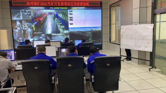 當(dāng)日9:00整,礦調(diào)度值班員接到井下1308運(yùn)順掘進(jìn)工作面跟班隊(duì)長(zhǎng)電話(huà)匯報(bào):“1308運(yùn)順掘進(jìn)工作面出現(xiàn)異響,巷道風(fēng)流紊亂,四聯(lián)巷風(fēng)門(mén)變形,巷道口有大量煙霧和粉塵出現(xiàn),正組織當(dāng)班人員按照避災(zāi)路線(xiàn)進(jìn)行撤離。”隨即,冶坪煤礦迅速啟動(dòng)事故應(yīng)急預(yù)案,演練正式開(kāi)始。調(diào)度信息中心通知井下全體職工緊急有序升井,搶險(xiǎn)救援組、救援保障組、技術(shù)專(zhuān)家組和對(duì)外聯(lián)絡(luò)組立即投入到搶險(xiǎn)救援工作中。應(yīng)急救援指揮部成員相互溝通協(xié)調(diào),及時(shí)采取有效措施,有條不紊地進(jìn)行每一道演練程序,迅速地完成著每一道救災(zāi)任務(wù)。演練歷時(shí)1小時(shí)35分鐘圓滿(mǎn)結(jié)束。
