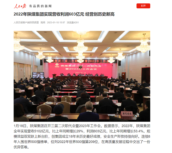 1月18日,陜煤集團(tuán)公布數(shù)據(jù)顯示,2022年,陜煤集團(tuán)全年實(shí)現(xiàn)營(yíng)收5102億元,比上年同期增長(zhǎng)29%,利潤(rùn)603億元,比上年同期增長(zhǎng)53.4%,創(chuàng)集團(tuán)成立18年來(lái)歷史最好成績(jī)。 2022年,陜煤集團(tuán)各實(shí)體產(chǎn)業(yè)板塊緊扣供需實(shí)際,積極實(shí)施相機(jī)調(diào)控,有效實(shí)現(xiàn)了提質(zhì)、穩(wěn)量、增效目標(biāo)。其中,完成煤炭產(chǎn)銷量2.3億噸,各類化工產(chǎn)品產(chǎn)量接近2000萬(wàn)噸,發(fā)電量突破500億度,粗鋼產(chǎn)量保持在1200萬(wàn)噸水平,其他實(shí)物量指標(biāo)穩(wěn)中有進(jìn)。 同時(shí),集團(tuán)全面發(fā)力“雙智”建設(shè),在行業(yè)率先開(kāi)展數(shù)據(jù)標(biāo)準(zhǔn)化治理和智能專網(wǎng)建設(shè),上線運(yùn)行智能礦井地質(zhì)保障等8大智能信息系統(tǒng),并入選工信部“2022特色工業(yè)互聯(lián)網(wǎng)50佳”榜單。7處全國(guó)首批智能化示范煤礦通過(guò)國(guó)家驗(yàn)收,彬長(zhǎng)、黃陵等5個(gè)智慧礦區(qū)先后建成,建成智能礦井28處,研發(fā)應(yīng)用智能快掘系統(tǒng)76套、智能機(jī)器人198個(gè),智能化產(chǎn)能占比達(dá)99%。“智能掘進(jìn)機(jī)器人系統(tǒng)”獲國(guó)家首臺(tái)套重大技術(shù)裝備認(rèn)定,全國(guó)首臺(tái)套450米超長(zhǎng)智能采煤工作面投入運(yùn)行,10米超大采高智能化采煤機(jī)進(jìn)入制造階段。 集團(tuán)還積極推進(jìn)綠色轉(zhuǎn)型,在重點(diǎn)行業(yè)企業(yè)大力開(kāi)展環(huán)保設(shè)施運(yùn)行能效大會(huì)診,全年投入資金18.3億元,實(shí)施94項(xiàng)設(shè)施提標(biāo)改造工程,鋼鐵、水泥、電力等板塊企業(yè)已實(shí)現(xiàn)大氣主要污染物超低排放。全面建成煤礦地質(zhì)環(huán)境監(jiān)測(cè)系統(tǒng),部署監(jiān)測(cè)設(shè)備1500余套,實(shí)現(xiàn)遙感監(jiān)測(cè)覆蓋2059平方公里,實(shí)現(xiàn)重點(diǎn)部位環(huán)保監(jiān)測(cè)全天候覆蓋。 在技融雙驅(qū)疊加成長(zhǎng)方面,德國(guó)、日本技術(shù)研究院相繼落地,六大研究院、七大產(chǎn)業(yè)示范基地與秦創(chuàng)原30億元基礎(chǔ)研究創(chuàng)新基金,聯(lián)合搭建的“7個(gè)國(guó)家級(jí)+50個(gè)省級(jí)”科研平臺(tái),正在發(fā)生耦合與聚變。目前已累計(jì)組建科技經(jīng)紀(jì)人團(tuán)隊(duì)81個(gè),組建引進(jìn)6支“科學(xué)家+工程師”隊(duì)伍,積極推進(jìn)249項(xiàng)基礎(chǔ)研究項(xiàng)目和10個(gè)工業(yè)化示范項(xiàng)目,全力打造原創(chuàng)技術(shù)“策源地”。 2023年,陜煤集團(tuán)將繼續(xù)踐行安全生產(chǎn)、經(jīng)濟(jì)增長(zhǎng)、能源穩(wěn)價(jià)保供等責(zé)任和使命,努力完成營(yíng)收5500億元和利潤(rùn)500億元的工作目標(biāo),全力推動(dòng)陜煤集團(tuán)創(chuàng)建世界一流企業(yè)再上新臺(tái)階。 |
